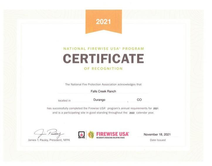 Section titled “National Firewise USA Program Certificates”- 2023 FCR Firewise USA Certificate